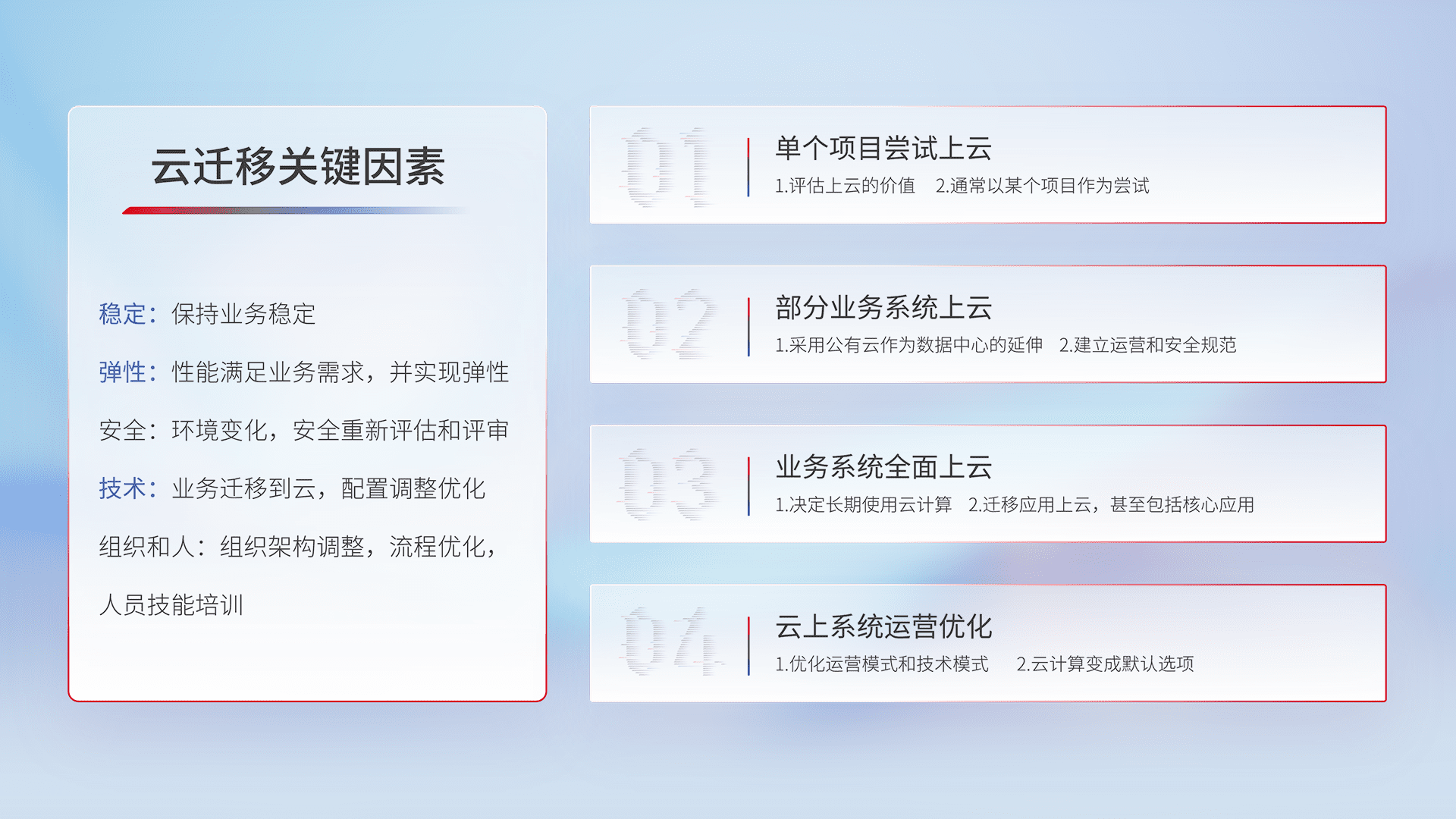 结合实际业务,,,从规划设计、、云平台选型、、、、云原生改造、、、、数据迁移、、、、集成交付,,,迁移全过程为客户识别最佳上云路径,,做好风险识别管理,,设计网络架构、、、身份权限、、、、安全审计合规、、操作审计、、、日志审计、、、监控告警策略、、、、多站点容灾设计等,,,对云上基础设施进行整体规划,,,提升IT治理水平,,以满足弹性、、、高可用、、、、高性能的需求。。。