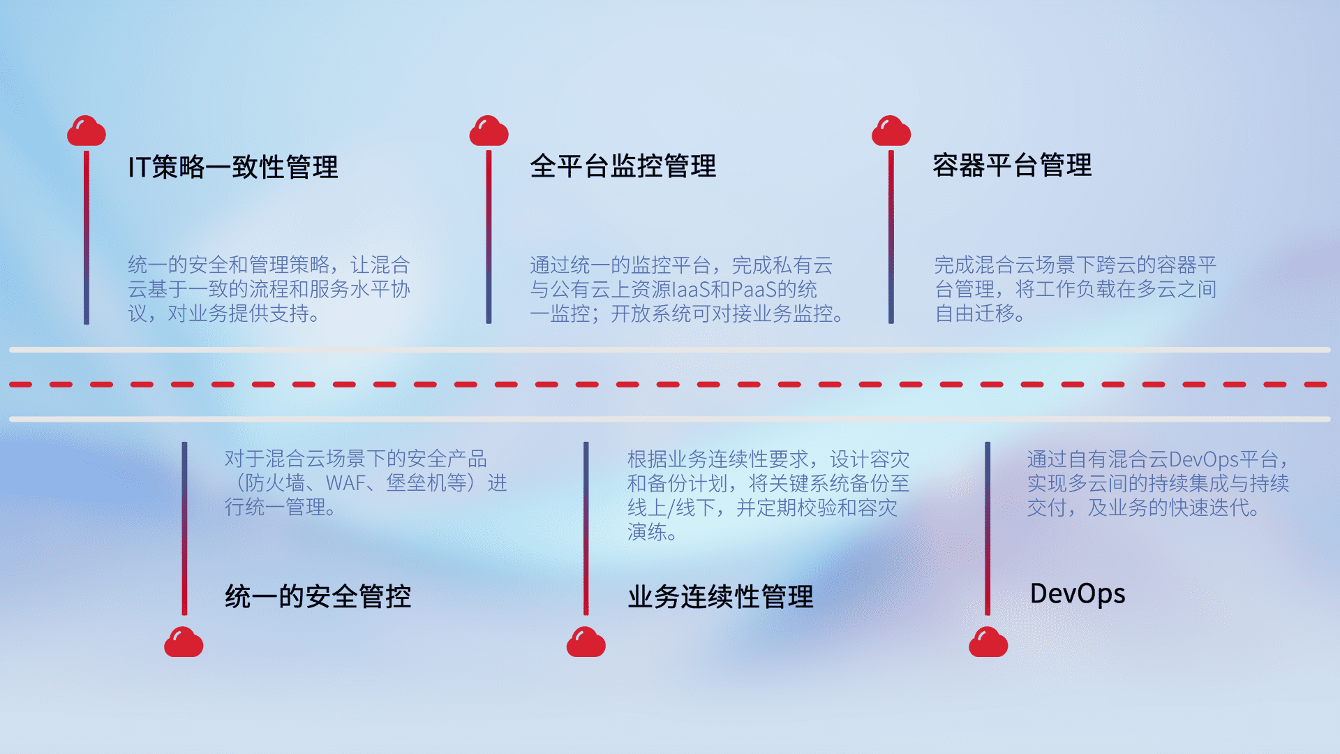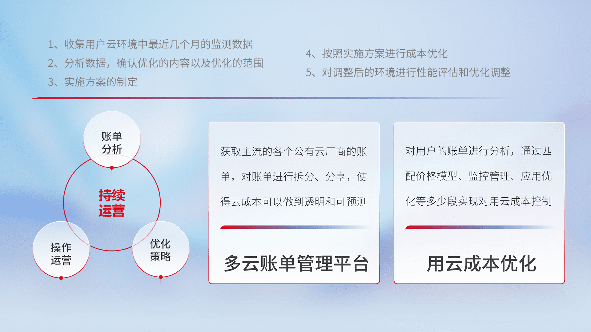 通过多云纳管,,,以统一的资源数据模型把客户的云资源进行抽象和封装,,,,进而实现对多云资源的统一操作,,保障云资源管理的可靠性、、稳定性与可用性。。量身定制化运维内容,,,配置、、、开发运维、、、、补丁管理、、备份、、监控、、、认证和访问管理、、、、审计和日常巡检等,,,,保障在用云过程中的可靠度,,稳定度以及高可用率。。。