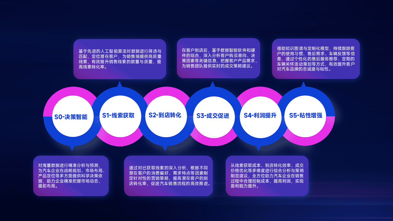 基于销售转化漏斗的薄弱环节,,,为客户提供数据+模型+运营的智能应用,,,实现销售业绩的提升;推动线索管理全链路的精细化管理和运营。。